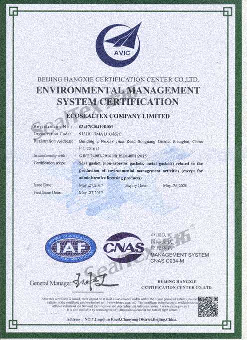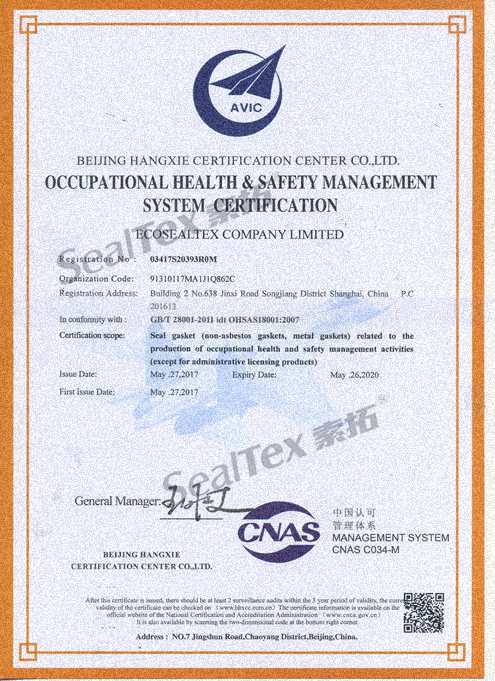 為了更好的推動“禁止使用石棉制品”進(jìn)程、推進(jìn)環(huán)保事業(yè)、樹立企業(yè)形象,我司于2017年通過了ISO14001環(huán)境管理體系及OHSAS18001職業(yè)健康安全管理體系的認(rèn)證并獲得認(rèn)證證書。