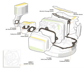 1、空氣濾清器(Air cleaner gasket)  2、化油器(Carburetor gasket) 3、進(jìn)氣口(Intake gasket) 4、氣門室蓋(Valve cover gasket) 5、通風(fēng)孔(Breather gasket) 6、呼吸槽(Breather passage gasket) 7、曲軸箱體(Crankcase gasket)  |