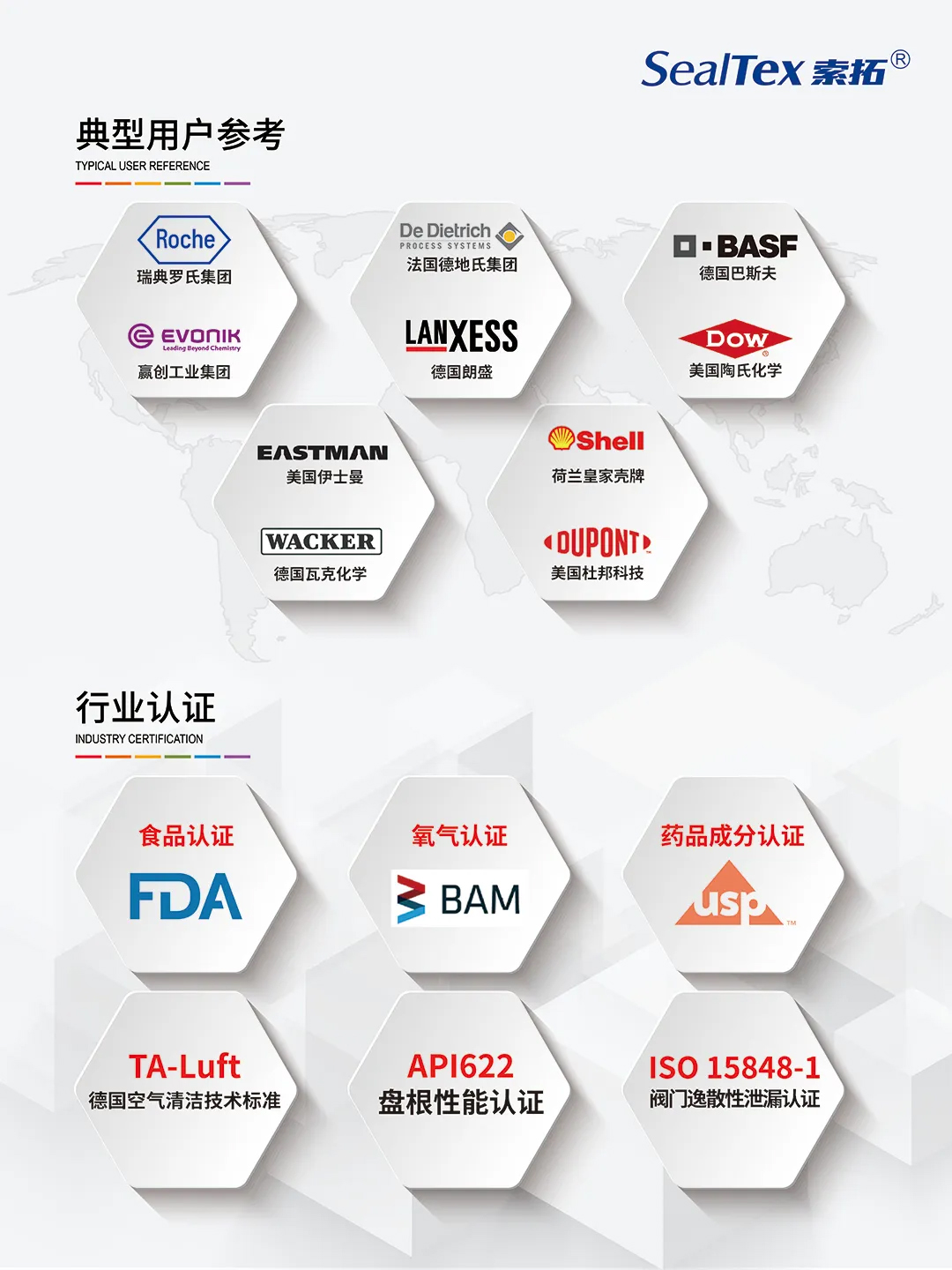 我司代理合作品牌TEADIT泰迪已為全球多家知名化工企業(yè)提供密封解決方案服務(wù),例如:BASF巴斯夫、Shell殼牌、Roche羅氏等。且產(chǎn)品可滿足FDA、BAM、DVGW、ups、TA-Luft、API622、ISO 15848-1等不同標準要求。還在耐高溫、耐腐蝕等性能上表現(xiàn)出色,能夠滿足天然氣、石油、化工等嚴苛工況下的密封需求
